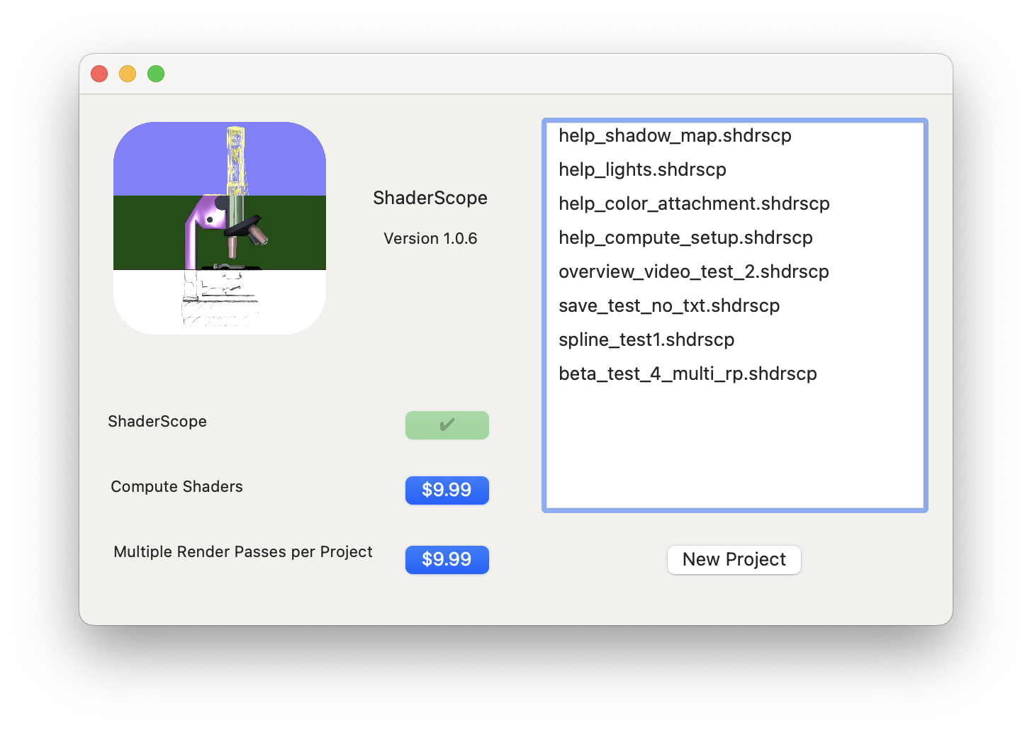 ShaderScope offers two in-app purchase products, either of which you can purchase by clicking their button on the launch screen (which can be opened by clicking Help -> In-App Purchase if it's not already showing).
