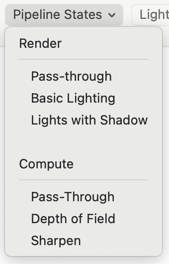 You can find this new functionality in the Pipeline State toolbar menu on the Shader Path window. It will now include three starter compute pipeline states you can add to your project.
