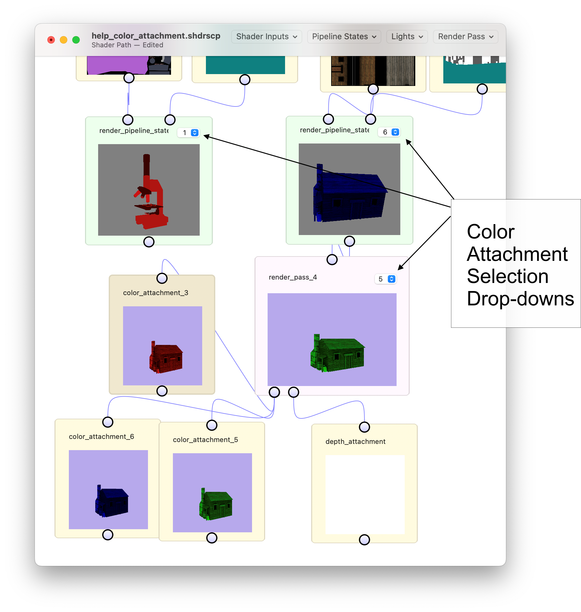 Render Pipeline States render to color attachment 0 and a depth attachment if neither is specified. If you would like to render to more than one color attachment ShaderScope supports this. Simply add a struct to your shader code calling out the color attachments you'd use, specify that struct as the data type returned by your fragment shader, and click the Recompile button. Any Render Passes that are rendering this Render Pipeline State's content will automatically create and adjust their corresponding output textures to match the new color attachments (if the color attachments for the Render Pipeline States connected to a Render Pass are inconsistent the Render Pass will show a message describing the problem). You can view the output for each color attachment to which you're rendering by using the drop-down menu.