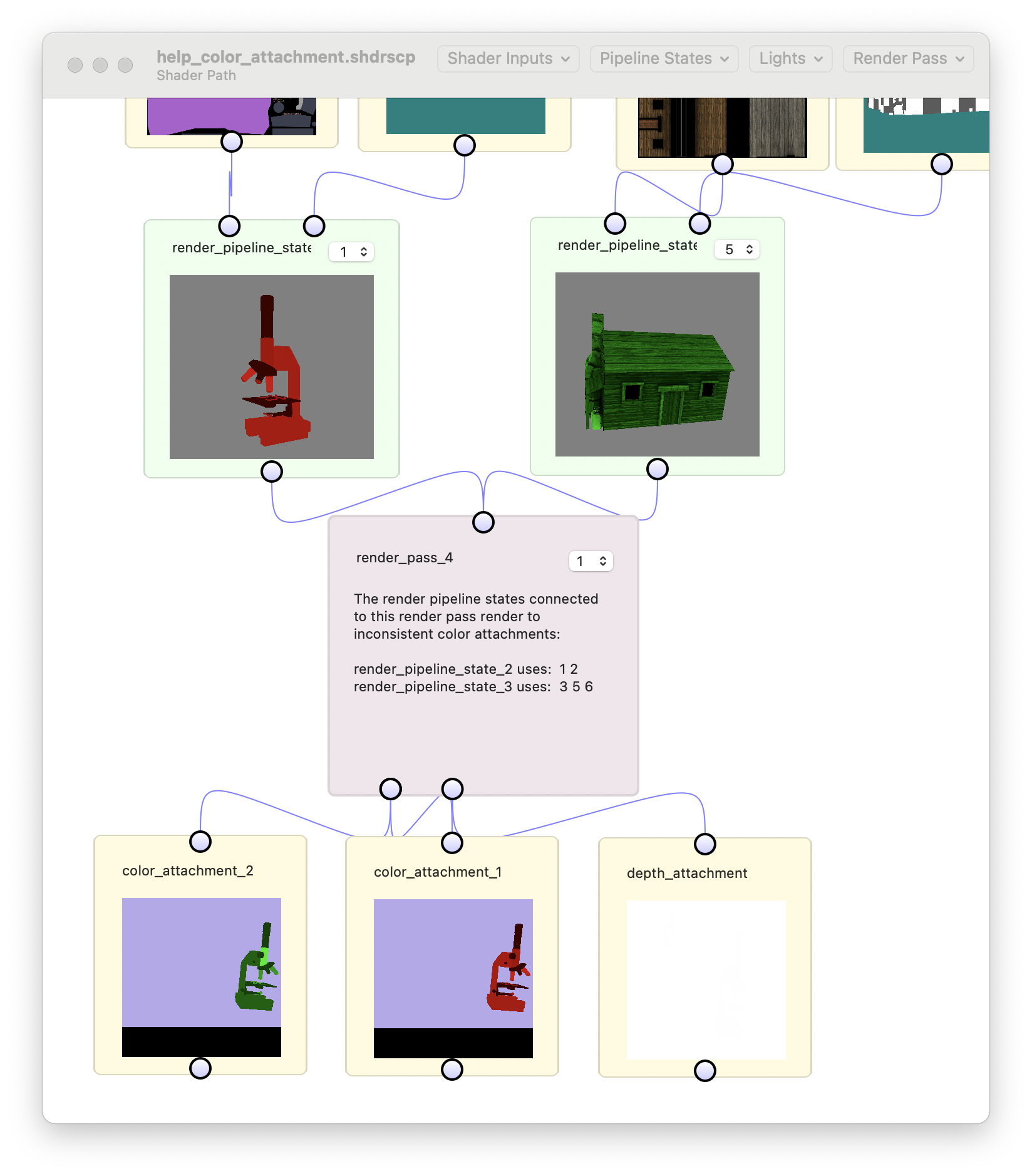 Render Pipeline States render to color attachment 0 and a depth attachment if neither is specified. If you would like to render to more than one color attachment ShaderScope supports this. Simply add a struct to your shader code calling out the color attachments you'd use, specify that struct as the data type returned by your fragment shader, and click the Recompile button. Any Render Passes that are rendering this Render Pipeline State's content will automatically create and adjust their corresponding output textures to match the new color attachments (if the color attachments for the Render Pipeline States connected to a Render Pass are inconsistent the Render Pass will show a message describing the problem). You can view the output for each color attachment to which you're rendering by using the drop-down menu.